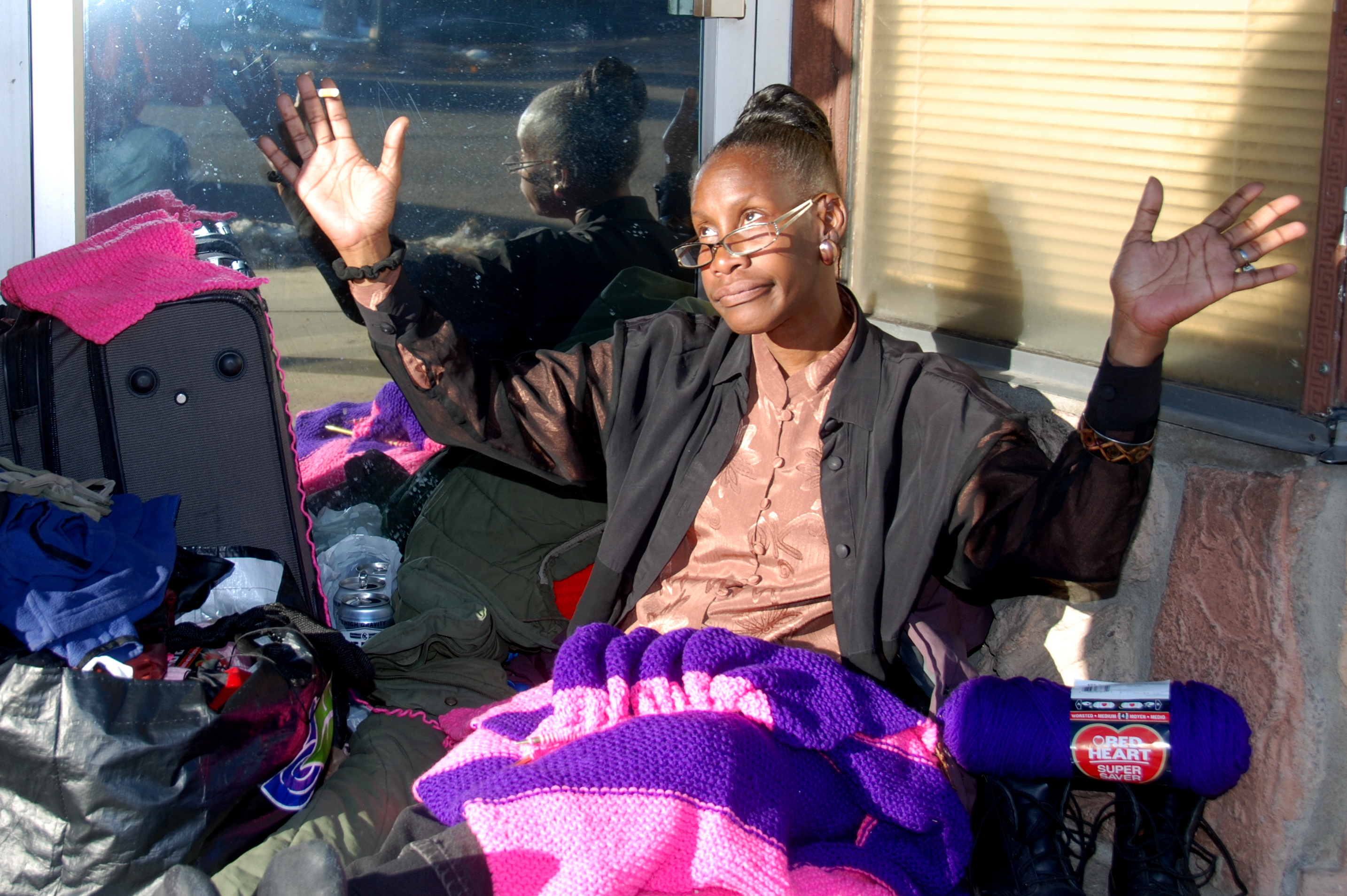 My second homeless artist lives on the street too, East Colfax – one the longest and most fascinating streets spanning Denver and surrounding cities.  Some might not call her an artist, just a crafts person since her medium is wool and her skill is knitting.  She claimed she had lived on the street for several years, I think partly by choice.  Any other place was too confining.  Once again, I bought a work of art – a red and black blanket perfect for that emergency blizzard storm.  I made the purchase less for the aesthetic value of the art than out of admiration for her entrepreneurial energy.
