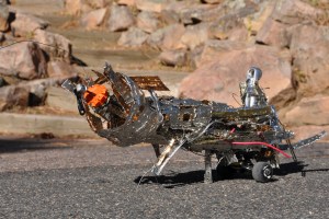 My most recent purchase was from a homeless (or so he claimed) person in Boulder just last Monday.  I spotted this thing on the sidewalk.  It looked like a mini semi-trailer at first.  Then it looked like it had morphed into a grasshopper.  It was definitely composed of all found materials – mostly aluminum cans cut apart and the edges serated.  Wires, some wrapped, and some stripped are used for the guts and the sensor aerials.  A faucet for some anterior feature.  A set of wheels which look like they come from a skate board.  My new artist friend had several other works on display too, but the one I saw first was the one I liked best.  He said he wanted $855 thousand and change for this work. I said I didn’t have $800k. He said, “you didn’t listen, I said $855,000”. He explained that this was a fair price because of all the creative input, the technical knowledge, the proprietary insights, etc.  I offered a $50 downpayment. He put his hand out and accepted, and then he gave me a calling card – a squashed and squared tin can.  His name was not on it but it was his sign.